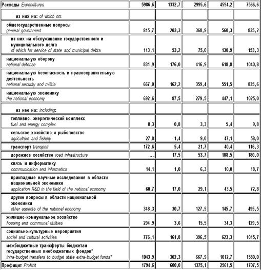 Доходы федерального бюджета на 2009 г. запланированы в сумме 6,3 трлн. руб., расходы - 9,5 трлн. руб. Ожидается, что с учетом снижения доходов дефицит федерального бюджета составит около 8% ВВП. При этом ожидается, что в номинальном выражении ВВП России в текущем году сократится до 40,42 трлн. руб. (в 2008 г. - более 42 трлн. руб). Из средств Резервного фонда в 2009 г. в экономику планируется направить 2,7 трлн. руб. Это предельная сумма, которая возможна при сохранении прогноза инфляции на уровне 13-14%.
