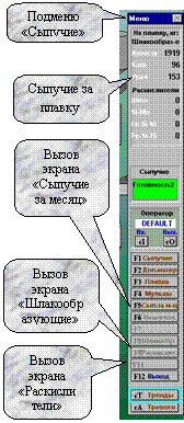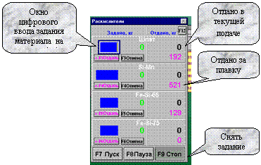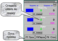 При вызове экрана “раскислители” или “шлакообразующие” оборудование, входящее в группы (1.1 или 1.2) и соответствующие дозаторы Д1…Д4 или Д6,Д7 переводится в автоматический режим работы.