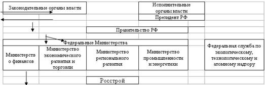 - органы непосредственного управления инвестиционно-строительной деятельностью (Министерство экономического развития и торговли, Министерство финансов, Министерство промышленности и энергетики, Министерство регионального развития, Росстрой);