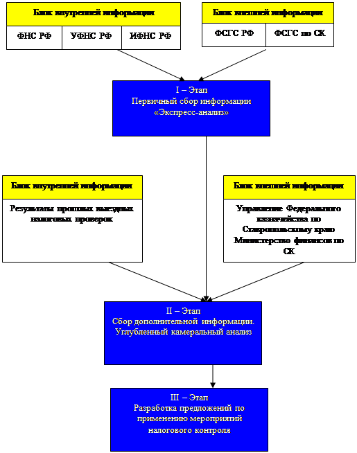 На первом этапе производится сбор и анализ информации о деятельности налогоплательщиков, получаемой от, Федеральной службы государственной статистики, Федеральной службы государственной статистики по Ставропольскому краю. Определяется налоговая нагрузка на организации (в рамках соответствующих групп). Производится анализ налоговой нагрузки по каждой группе. Определяется перечень налогоплательщиков, имеющих меньшую нагрузку, чем в среднем по анализируемой группе.