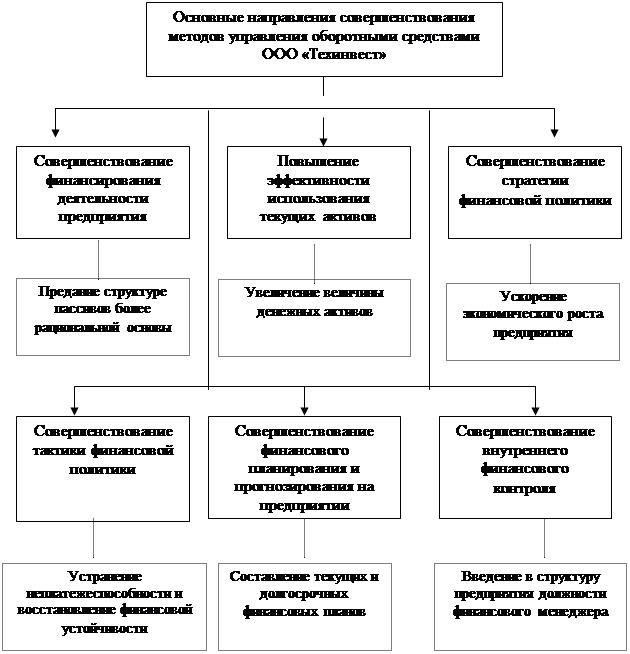Исходя из специфики проведенного анализа финансовой деятельности объекта исследования и теоретических основ финансовой политики предприятия в условиях утраты платежеспособности, мною предлагаются следующие направления совершенствования методов управления оборотными средствами предприятия в ООО «Техинвест», которые можно представить в соответствии с рисунком 9.
