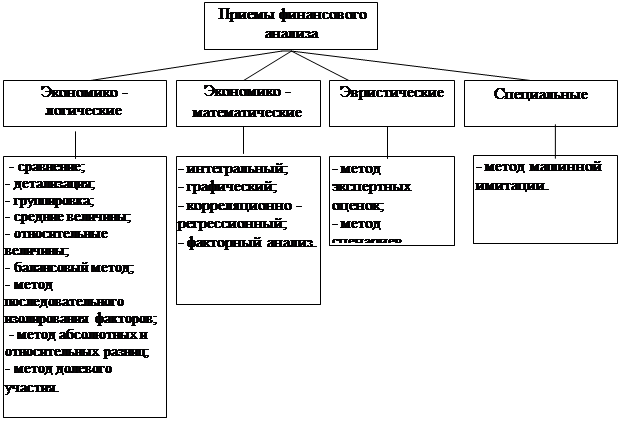 Для проведения финансового анализа предприятия используется совокупность взаимосвязанных и взаимообусловленных приемов анализа, направленных на достижение определенных результатов в конкретных условиях, т.е. определенная методика анализа. Существуют различные классификации методов проведения финансового анализа.