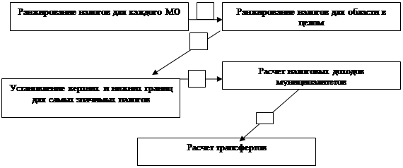 В модели используется следующий алгоритм расчетов, определяющийся в зависимости между долей поступающей в виде отчисления от налогов и минимальной бюджетной обеспеченностью.