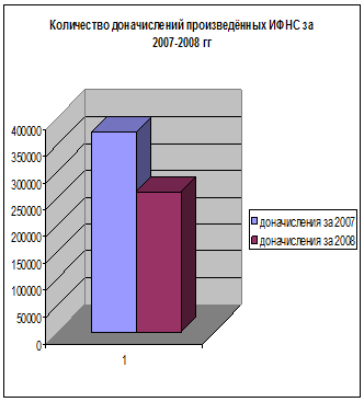 Мы видим, что количество проверок в 2008 году по отношению к 2007 увеличилось, однако количество проверок, выявивших нарушения, сократилось, чем и было вызвано сокращение суммы доначислений за 2008 год, по сравнению с 2007. Таким образом, несмотря на возросшую активность работы ИНФС (увеличение количества проведенных камеральных проверок в 1.12 раз), сумма доначислений уменьшилась (в 1.42 раз).