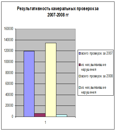 На данной диаграмме мы видим, что за 2007 год проведено - 119326 камеральных налоговых проверок. Из них, выявившие нарушения – 5605 проверок. В 2008 году всего проведено проверок – 134089. Число выявивших нарушения составило – 3316 проверок.
