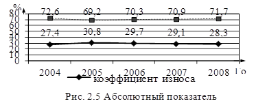 Анализируя график на рис. 2.5 следует отметить, что основные средства предприятия находятся в удовлетворительном состоянии, то есть коэффициент износа за анализируемый период (кроме 2005 года) не превышал 30%, а коэффициент годности основных средств не опускался ниже допустимой нормы.