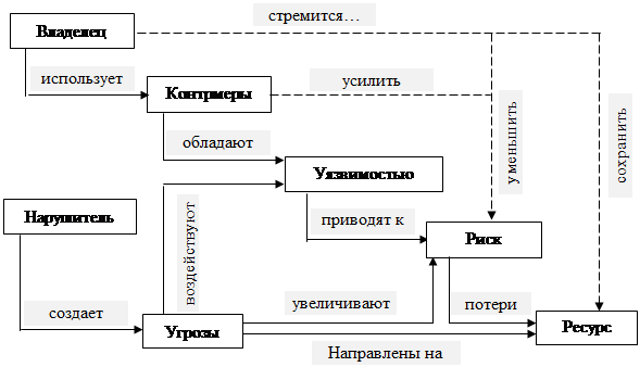 При построении модели будут учитываться взаимосвязи между ресурсами. Например, выход из строя какого-либо оборудования может привести к потере данных или выходу из строя другого критически важного элемента системы. Подобные взаимосвязи определяют основу построения модели организации с точки зрения информационной безопасности.