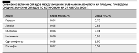 Даже по такому параметру, как величина спрэда между лучшими заявками на покупку и на продажу, котировочные "стаканы" ФБ ММВБ на порядок лучше таковых на РТС (см. таблицу). В таблице приведено сравнение величин спрэдов на одни и те же акции на двух рынках.