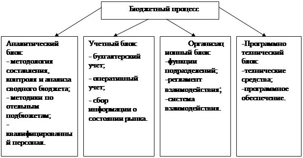 Процесс разработки, контроля и анализа исполнения бюджета предполагает регистрацию и обработку больших массивов информации, что затруднительно сделать вручную. В бюджетном процессе уровень оперативности и качества учетно-аналитической работы существенно повышается, а количество ошибок сокращается при использовании программно-технических средств. Программно-технические средства, используемые структурами предприятия, задействованными в бюджетном процессе, составляют программно-технический блок системы бюджетирования.
