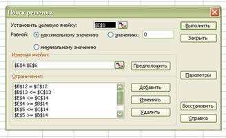 Расчет задачи осуществим в среде MS EXEL. Для решения используем надстройку редактора MS EXEL “Пакет анализа”, функцию «поиск решения».