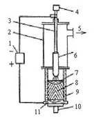 1–источник питания; 2–рабочая камера; 3–электродержатель; 4–механизм подачи электрода; 5–к вакуумным насосам; 6–электрод; 7–жидкий металл; 8–слиток; 9–кристаллизатор; 10–шток для подъема поддона; 11–поддон.