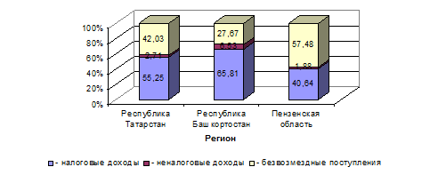 Рис. 2.1.1. Структура доходной части бюджетов Республики Татарстан, Республики Башкортостан и Пензенской области за 2009 год.