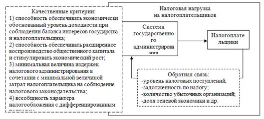 В рамках принятой модели обратная связь может характеризоваться такими показателями, как уровень налоговых поступлений, задолженность по налогу; количество убыточных организаций; доля теневой экономики и др. Для оценки эффективности и соответствия современным требованиям данной системы необходимо задействовать ряд качественных критериев.