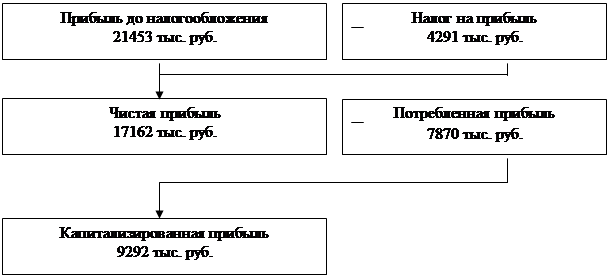 Из приведенного выше рисунка видно, что из суммы выручки от реализации продукции вычитается сумма себестоимости продукции и в результате получается валовая прибыль. Из нее в свою очередь вычитается сумма прочих расходов и получается прибыль до налогообложения. Из прибыли до налогообложения вычитается налог на прибыль и получается чистая прибыль. В свою очередь из суммы чистой прибыли вычитается сумма потребленной прибыли и получается сумма капитализированной прибыли. [10; С. 147]