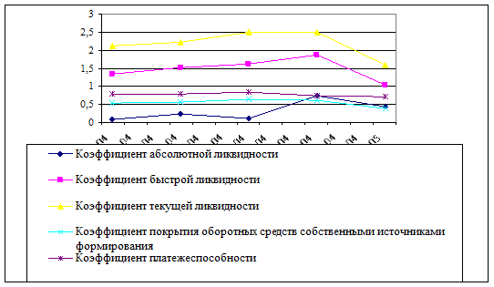 В начале года наблюдается благоприятная тенденция роста значений показателя с 0,77 на 1.01.04 до 0,82 на 1.07.04. В последующих периодах значения коэффициента упали с 0,73 на 1.10.04 до 0,7 на 1.01.05. Все же, несмотря на это, платежеспособность предприятия находится на достаточно высоком уровне.