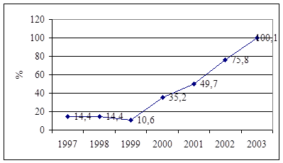 Существенный прогресс в развитии лизингового бизнеса наметился в 1998–2002 гг. Он привел к росту лизинговых операций по трем основным причинам. Первая – банковский кризис 1998 г., вынудивший организации быстро обратить внимание на лизинг как альтернативный банковскому кредитованию источник финансирования капитальных вложений. Вторая – разрушение нормативных правовых преград и устранение противоречий в виде принятия Закона о лизинге в 2002 г. и отмены лицензирования лизинговой деятельности. Третья – оптимизация институциональной организации лизингового бизнеса.