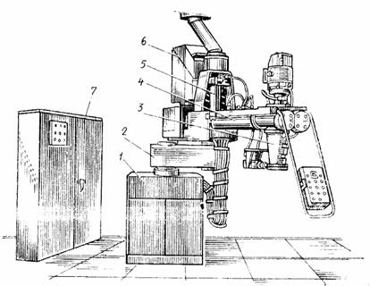 Смеситель состоит из основания 1, рычага поворотного 2, камеры предварительного смешивания 3 с приводом, камеры окончательного смешивания (вихревой головки 4) с приводом, дозатора песка 5 с разделителем потока, трубы поворотной 6 гидропневмооборудования и электрооборудования 7 (рис. 2).