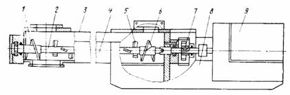 Труба поворотная (рис. 8) служит для подачи леска из цехового бункера в камеру предварительного смешивания. Труба поворотная состоит из приемной трубы 7, задвижки 2 в корпусе с подшипниками. Крепится труба поворотная фланцем к кронштейну