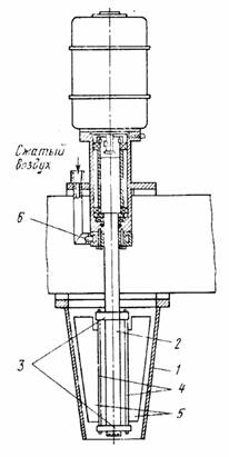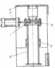 Дозатор песка (рис. 5) предназначен для дозировки кварцевого песка; состоит из шибера, прикрепленного к кронштейну 3. Шибер состоит из пластины 1, которая перемещается по направляющей планке 4 с помощью пневмоцилиндра 2. Труба 6 с окном 5 крепится к направляющей планке 4 и служит для направления струи леска в приемное окно камеры предварительного смешивания.