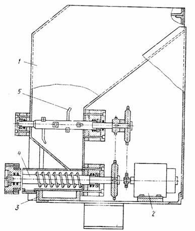 Дозатор порошкообразных добавок (рис. 6) служит для дозированной подачи в камеру предварительного смешивания сухих порошкообразных добавок. Он состоит из бункера 1, смонтированного на раме 3, и шнекового вала 4 с приводом постоянного тока 2. Для предотвращения зависания и слеживания материала имеется ворошитель 5. Дозатор монтируется на раме камеры предварительного смешивания.