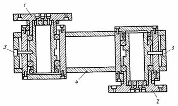Рычаг поворотный (рис. 7) позволяет осуществлять поворот корпуса смесителя относительно двух вертикальных осей и состоит из корпуса 4, двух вертикальных валов 1 и 2. Каждый вал вращается в двух радиальных и одном упорном подшипниках. На корпусе 4 имеются два винта 3, которые фиксируют смеситель в нужном положении.