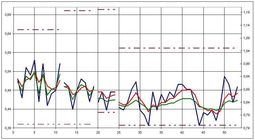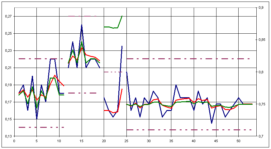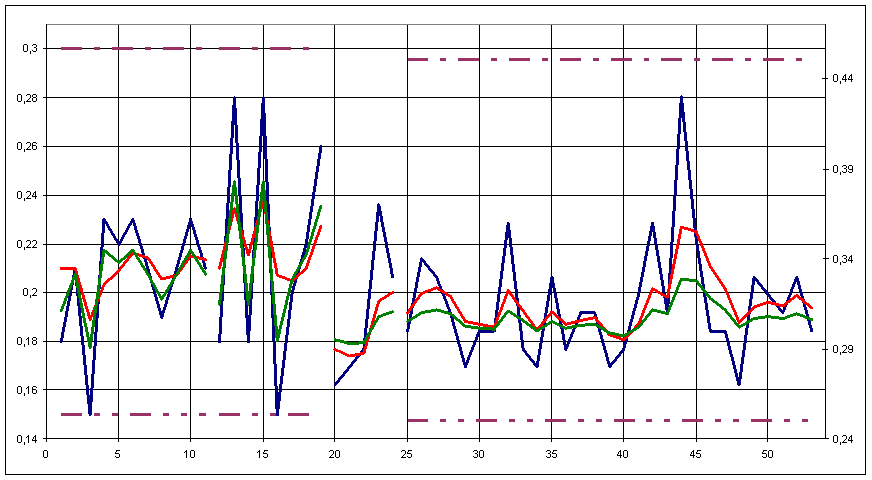 Результаты обработки весовых кривых с использованием алгоритма текущего среднего представлены в таблице 5 и показаны графически на рисунке 7. Результаты обработки при помощи алгоритма робастной фильтрации сведены в таблицу 6 и показаны на рисунке8.