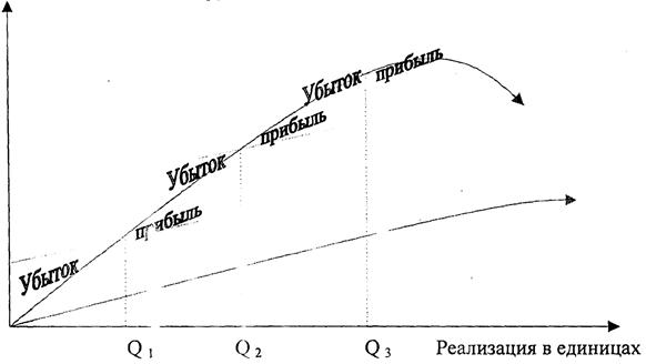 В силу этих факторов точка безубыточности в длительном периоде претерпевает ряд изменений своего значения, причем, каждое следующее значение больше предыдущего Q1<Q2 <Q3 (рис. 6)