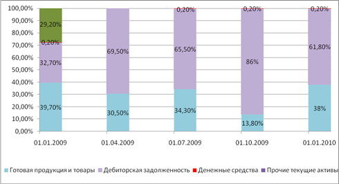Значительную часть оборотных активов занимает дебиторская задолженность. Во всех периодах этот показатель принимает значение от 32,7% в первом квартале до максимального – 86,0% в четвертом квартале. Высокая дебиторская задолженность связана с падением спроса платежеспособности населения, т.е. падения выручки. Денежные средства во всех кварталах занимают 0,2% кроме второго квартала во время, которого этот показатель равен 0%. Готовая продукция на складах в первом квартале занимает 37,9% однако с последующих кварталов она начинает постепенно снижаться до 13,8%. К началу следующего года показатель значительно изменился до 38%. Скачкообразное изменение готовой продукции говорит о сезонном спросе. Прочие текущие активы значительную долю занимают в 1 квартале (29,2%), в последующих кварталах этот показатель равен 0%.