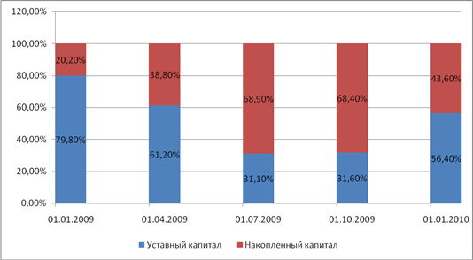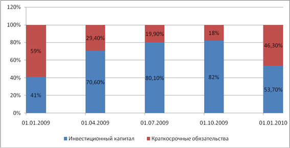 Общая доля инвестиционного капитала в пассивах высока. Максимум приходиться на 4 квартал – 82%. Минимум – на 1 квартал – 41%.