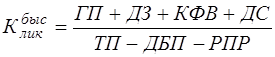 Коэффициент быстрой ликвидности (коэффициент промежуточной ликвидности) аналогичен коэффициенту текущей ликвидности, однако он исчисляется по более узкому кругу показателей, из расчетов исключаются производственные запасы, так как это наименее ликвидная статья в текущих активах. Рекомендуемое значение показателя составляет от 0,9 до 1. Коэффициент определяется по формуле: