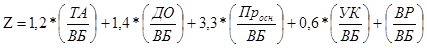 При проведении финансового анализа предприятия возникает необходимость определения будущего прогнозного состояния организации. Одним из прогнозных методов является метод-индекс Альтмана. Этот метод представляет собой функцию от некоторых показателей, характеризующих экономический потенциал предприятия и результаты его работы за отчетный период. В общем виде индекс кредитоспособности (Z) - Индекс Альтмана определяется: