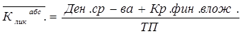 где Клик.абс – коэффициент абсолютной ликвидности; Ден.ср-ва – денежные средства предприятия; Кр.фин.влож – краткосрочные финансовые вложения; ТП –текущие пассивы.