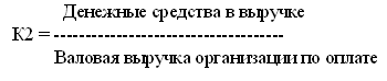 Доля денежных средств в выручке (К2) организации рассчитывается как доля выручки организации, полученная в денежной форме, по отношению к общему объему выручки:
