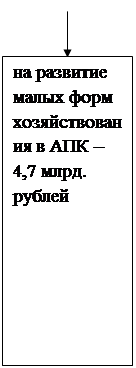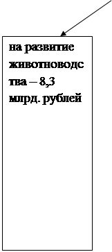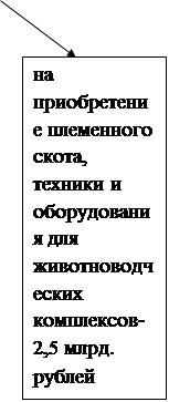 Объем расходов – 23,4 млрд. рублей, что на 7,1 % превышает уровень 2006 года и составляет 41,4% от общего объема средств федерального бюджета, предназначенных на государственную поддержку сельского хозяйства. Реализация проекта за счет средств федерального бюджета будет осуществляться по трем основным направлениям: развитие животноводства, стимулирование малых форм хозяйствования в АПК, обеспечение жильем молодых семей и молодых специалистов на селе. В том числе предусматривается возмещение части затрат на уплату процентов по кредитам: