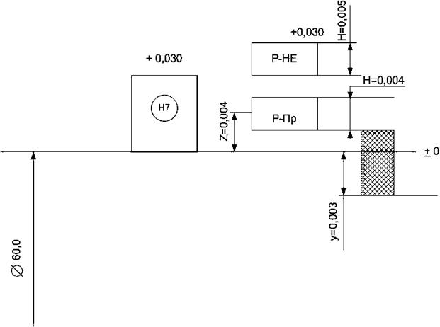 Р-НЕ = Dmax + 0,5Н = 60,030 + 0,0025 = 60,03325 – 0,005 мм