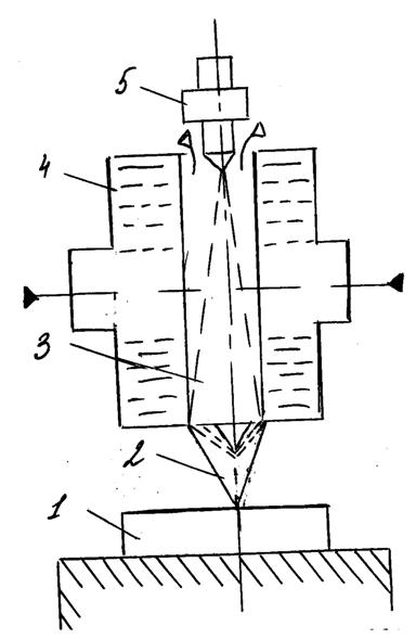 Дуговой разряд 3 возбуждается между вольфрамовым электродом 4, выполненным в виде трубы и охлаждённым проточной водой. В трубу подают газ (аргон, азот и др.) или смесь газов. Обжимая дуговой разряд, газ при соединении с электронами ионизируется и выходит из сопла головки в виде ярко светящейся струи 2, которая направляется на обрабатываемую заготовку 1.