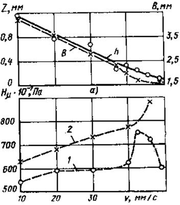 В образцах из стали У12 во второй зоне, зоне термического влияния, наблюдается неоднородность структуры, что подтверждается пониженной травимостью участков, расположенных на месте сетки вторичного цементита. Указанные участки характеризуются увеличенным количеством аустенита. Анализ кривых распределения твёрдости в образцах из сткли У12 показывает, что минимальной скорости перемещения образца твёрдости первого и второго слоёв зоны близки, тогда как пи более высоких скоростях твёрдость второго слоя заметно выше. Это обстоятельство определяется более равномерным распределением углерода в аустените за более длительное время лазерного нагрева. Твёрдость мартенсита при содержании углерода до 0,6% линейно зависит от последнего и практически не зависит от него при большом количестве углерода в стали.