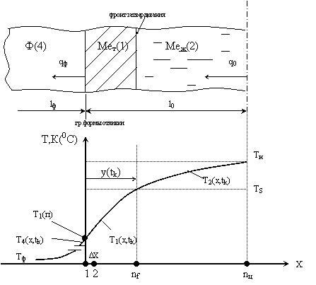 Полученная таким образом содержательная модель и ее графическая интерпретация затвердевания плоской отливки в объемной массивной форме, упрощает формулировку математической модели и достаточно хорошо отражает затвердевание на тепловом уровне, т.е. позволяет получить закон T=f(x;t).