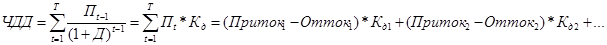 Чистый дисконтированный доход (далее – ЧДД) характеризует интегральный эффект от реализации проекта и определяется как величина, полученная дисконтированием (при постоянной ставке процента отдельно для каждого года) разницы между годовыми оттоками и притоками реальных денег, накапливаемых в течение горизонта расчета проекта: