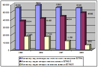 По состоянию на 01.01.2008 в региональной базе данных (далее РБД ЕГРН) содержатся сведения о 53730 юридических лицах (97,1 %),в Инд районе о 5252 юридических лица (96,4%), что обусловлено наличием ошибок в сведениях передаваемых с местного уровня для формирования региональной базы данных.