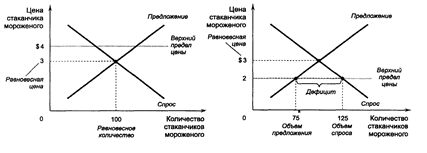 График на (Рисунке 2.3.1 – б) иллюстрирует другой, более интересный вариант, когда правительство определяет верхний предел цены в размере $ 2 за стаканчик. Так как равновесная цена в $ 3 выше установленной государством цены, предельную цену называют сдерживающим ограничением рынка. Силы спроса и предложения движут цену к равновесной цене, но рыночная цена «ударяется о потолок», препятствующий ее росту, и устанавливается на уровне верхнего предела цены. При этой цене объем спроса на мороженое (125 стаканчиков) превышает объем предложения (75 стаканчиков). Возникает дефицит мороженого, а значит, некоторые потребители, желающие приобрести мороженое, при существующей цене не смогут это сделать.