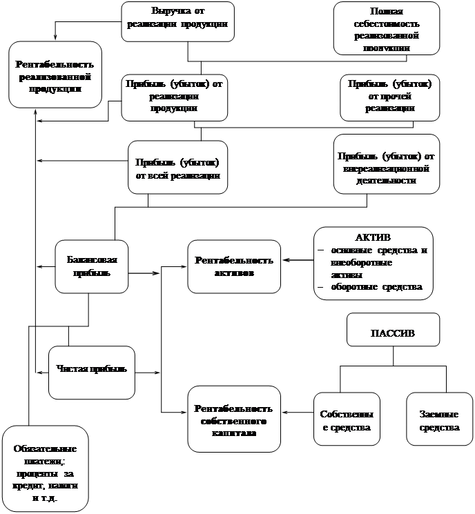 Расчет коэффициентов рентабельности исходя из приведенного выше деления позволяет достаточно полно оценить эффективность деятельности предприятия. Так, рентабельность реализованной продукции показывает какую прибыль приносит предприятию рубль вложенных средств, но она не позволяет оценить эффективность использования предприятием его активов: основных и оборотных средств и его пассивов: собственных и заемных средств. Оценить эффективность использования основных и оборотных средств позволяет расчет коэффициента рентабельности активов, который показывает сколько рублей прибыли приносит рубль всех вложенных в предприятие средств, но этот показатель не может дать ответ на сколько эффективно предприятие использует собственные и привлеченные источники финансирования. По этому для ответа на вопрос эффективно ли предприятие использует свои собственные средства, необходимо ли ей привлекать дополнительные займы и кредиты позволяет расчет коэффициента рентабельности собственных средств. Таким образом, расчет и сопоставление между собой коэффициентов этих трех групп позволит достаточно полно осветить эффективность основной деятельности предприятия, использования активов и пассивов, выявить сложившиеся тенденции, принять решения о необходимых мероприятиях по повышению рентабельности предприятия.