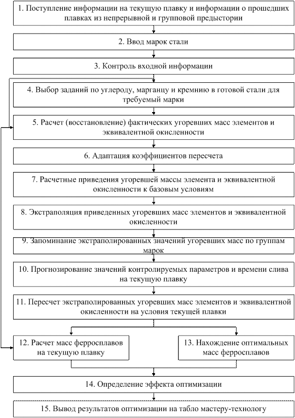 В блоке 1 поступление информации на текущую плавку и информация о прошедших плавках из непрерываемой и групповой предыстории включает в себя ввод с клавиатуры информации в объеме массива производственных данных на плавку и считывания из блоков данных из групповой и непрерывной предыстории параметров, необходимых для расчета.