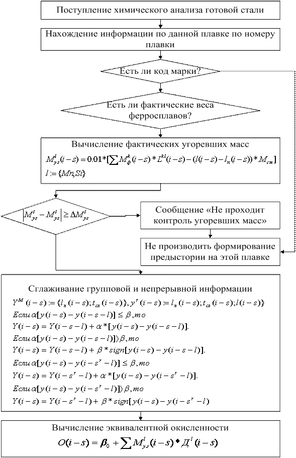 В блоке 5 осуществляется расчет (восстановление) фактических угоревших масс элементов и эквивалентной окисленности. По номеру плавки находится в предыстории бланк на эту плавку, по которому определяется, вводил ли мастер по этой плавке код марки, то есть, производился ли расчет ферросплавов на данную марку. Проверяется также, ввел ли контролер отдела технического контроля фактические веса ферросплавов, по которым производится расчет фактических угоревших масс элемента, определяемый как разность между массой элемента в отданном ферросплаве и массе элемента, находящегося на плавку. Если код марки или фактические веса раскислителей не вводились или фактический угар не проходит контроль по ограничению, то расчет по этой плавке не производится. Если введены код марки и фактические веса ферросплавов, угар элемента прошел контроль, по данной плавке формируется предыстория. В непрерывной предыстории производится релейно-экспоненциальное сглаживание значений углерода и марганца, полученных на повалке, и времени слива. В групповой предыстории производится релейно-экспоненциальное сглаживание значений углерода и марганца на повалке, времени слива, значений углерода, марганца и кремния готовой стали. Эквивалентная окисленность определяется как остаточная окисленность после отдачи раскислителей по каждой группе марок отдельно плюс пересчитанные в окисленность через коэффициент перевода Д угара марганца и кремния угоревшей массы. Блок-схема расчета фактических угоревших масс и эквивалентной окисленности представлена на рис.12.