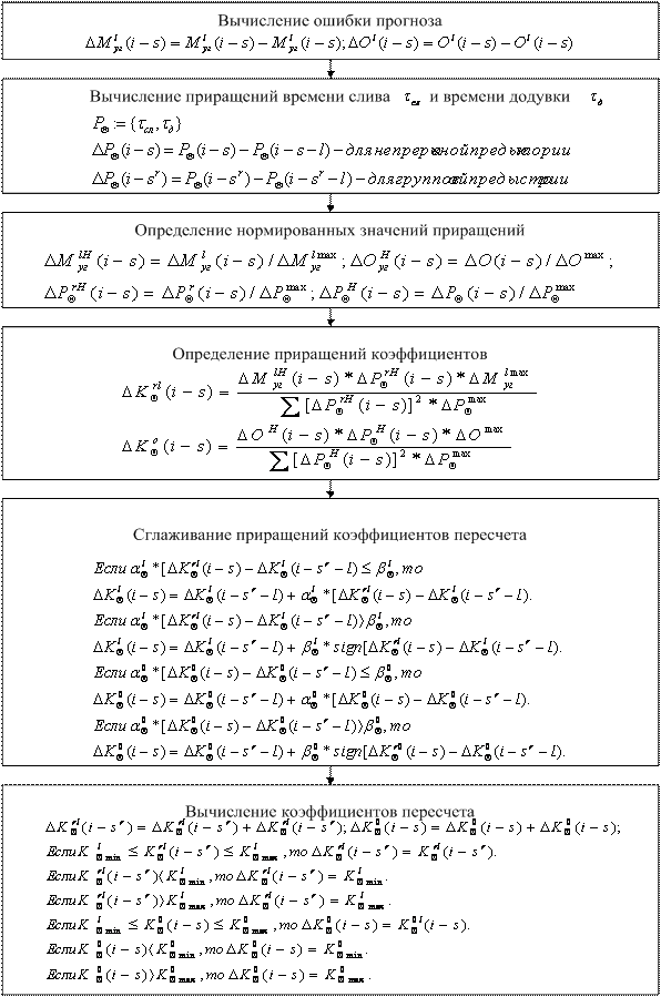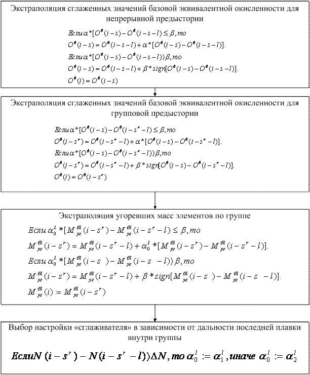 Сглаженные релейно-экспоненциальным фильтром значения базовых угоревших масс элементов прогнозируются на следующие плавки данной группы марок. Блок-схема алгоритма экстраполяции приведенных угоревших масс и эквивалентной окисленности представлена на рис.15.