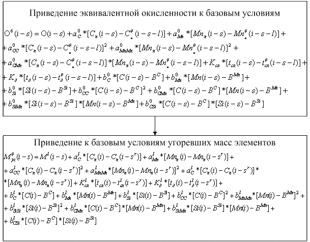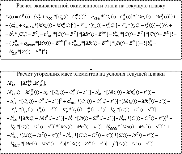 В блоке 11 осуществляется пересчет экстраполированных угревших масс элементов и эквивалентной окисленности на условия текущей плавки. Окисленность плавки О(i) перед раскислением оказывает существенное влияние на угар элементов. Приборов непосредственного контроля окисленности металла пока нет, и окисленность плавки считается по таким косвен-