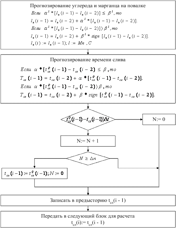 сглаженные релейно-экспоненциальным фильтром значения последнего экспресс-анализа. Информация о времени слива плавки поступает с запаздыванием по отношению к моменту раскисления на данной плавке, вследствие чего возникает необходимость в прогнозировании времени слива, которое осуществляется релейно-экспоненциальным фильтром, обеспечивающим защиту времени слива от случайных помех. Время слива колеблется от 4 до 6 мин. При времени слива, равном 3 мин, производится заделка сталевыпускного отверстия огнеупорным составом, а на следующей плавке время слива резко возрастает. В этом случае предусмотрен двукратный переопрос времени слива. Если на i-той плавке фактическое время слива резко увеличилось по сравнению с прогнозом, то прогноз на (i + 1)-ой плавке будет занижен для защиты от случайной помехи. Но если и на (i + 1)-ой плавке время слива будет таким же большим, то прогноз на (i + 2)-ую плавку будет принят, равным фактическому времени слива на (i + 1)-ой плавке, так как в этом случае делается вывод, что был произведен ремонт сталевыпускного отверстия, и время слива увеличилось. Прогнозирование времени слива на предстоящую i-ую плавку происходит после слива предыдущей (i – 1)-ой плавки. Блок-схема алгоритма прогнозирования контролируемых параметров и времени слива представлена на рис.16.