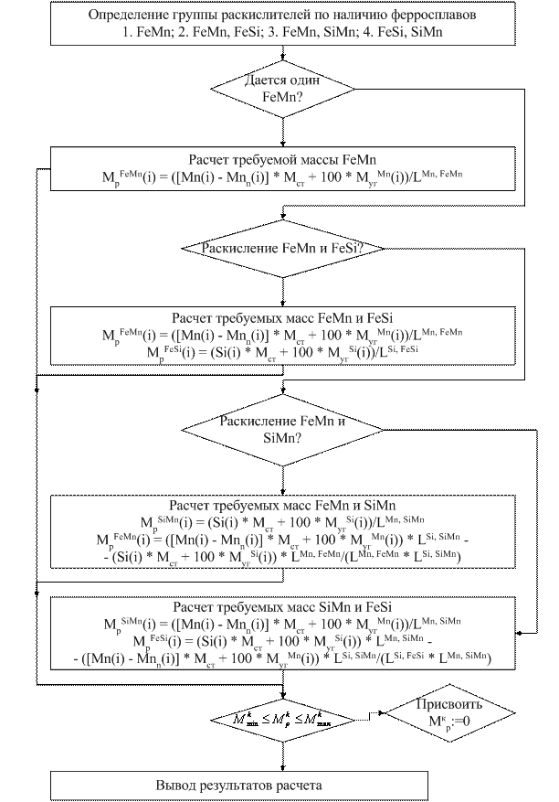 том прогнозируемого угара и процентного содержания элемента в ферросплаве. На тех марках, которые не раскисляются двумя ферросплавами, содержащими один и тот же элемент (FeMn, SiMn; FeSi, SiMn), расчетная масса находится решением системы двух уравнений. Если производится расчет FeMn и SiMn, то сначала рассчитывается SiMn на необходимое количество кремния в готовой стали, а затем – FeMn с учетом марганца в SiMn. Если производится расчет FeSi и SiMn, то сначала рассчитывается SiMn на необходимое количество марганца в готовой стали, а затем рассчитывается FeSi с учетом кремния в SiMn. Рассчитанные массы раскислителей проходят контроль на минимальный диапазон. Блок-схема алгоритма расчета масс ферросплавов представлена на рис.18.