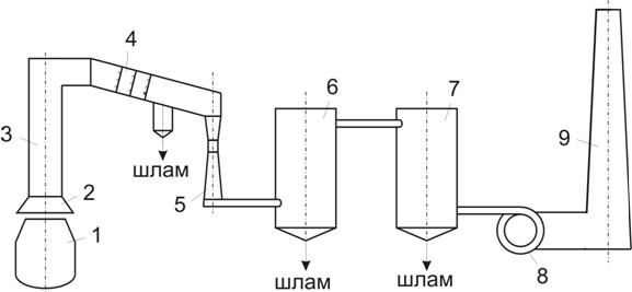 1 – конвертер; 2 – юбка котла-охладителя; 3 – котел-утилизатор; 4 – орошаемый газоход; 5 – труба Вентури; 6 – каплеуловитель №1; 7 - каплеуловитель №2; 8 – нагнетатель; 9 – дымовая труба.