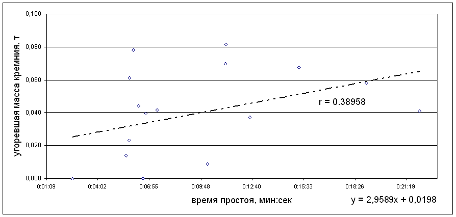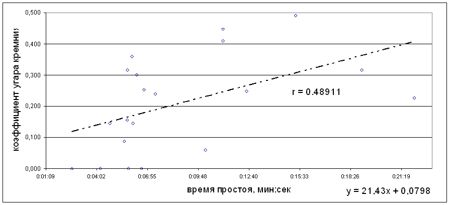 Рисунок 5.32- Зависимость коэффициента угара кремния от времени простоя, мин:сек
